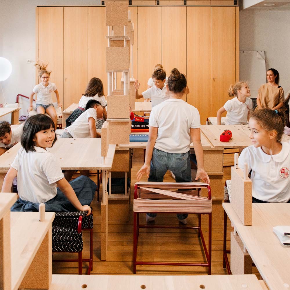 Le dispositif, dont chaque pièce est réalisée à partir de matériaux purs et non traités, choisis avec le plus grand soin pour leurs qualités naturelles, était accompagné d’une série de conversations et d’ateliers pratiques menés par smarin, durant lesquels les enfants ont pu prendre conscience de l’importance de leur posture et de leur mobilité en classe, du rôle du collectif dans de nombreuses activités, ou encore de l’importance du temps de pratiques sensibles dans l’acquisition des savoirs.