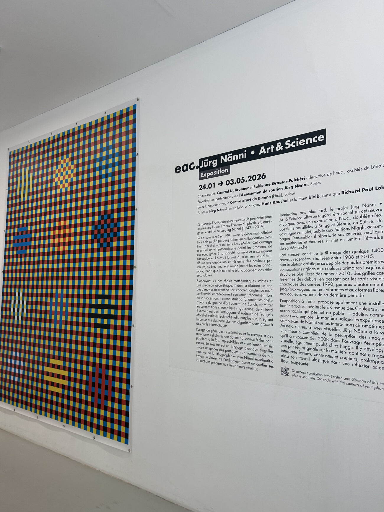 Au-delà de ses œuvres visuelles, Jürg Nänni a laissé une théorie complète de la perception des images, qu’il a exposée dès 2008 dans l’ouvrage «Perception visuelle», également publié chez Niggli. Il y développe une pensée originale sur la manière dont notre regard interprète formes, contrastes et couleurs, prolongeant ainsi son travail plastique dans une réflexion scientifique exigeante. L’exposition à l’eac. propose également une installation interactive inédite: le «Kiosque des Couleurs », un écran tactile qui permet au public, adultes comme jeunes, d’explorer de manière ludique les expériences complexes de Nänni sur les interactions chromatiques. Les visiteurs pourront également découvrir une sérigraphie de Richard Paul Lohse, ainsi qu’une sérigraphie de Verena Loewensberg, artistes qui ont particulièrement influencé Jürg Nänni.